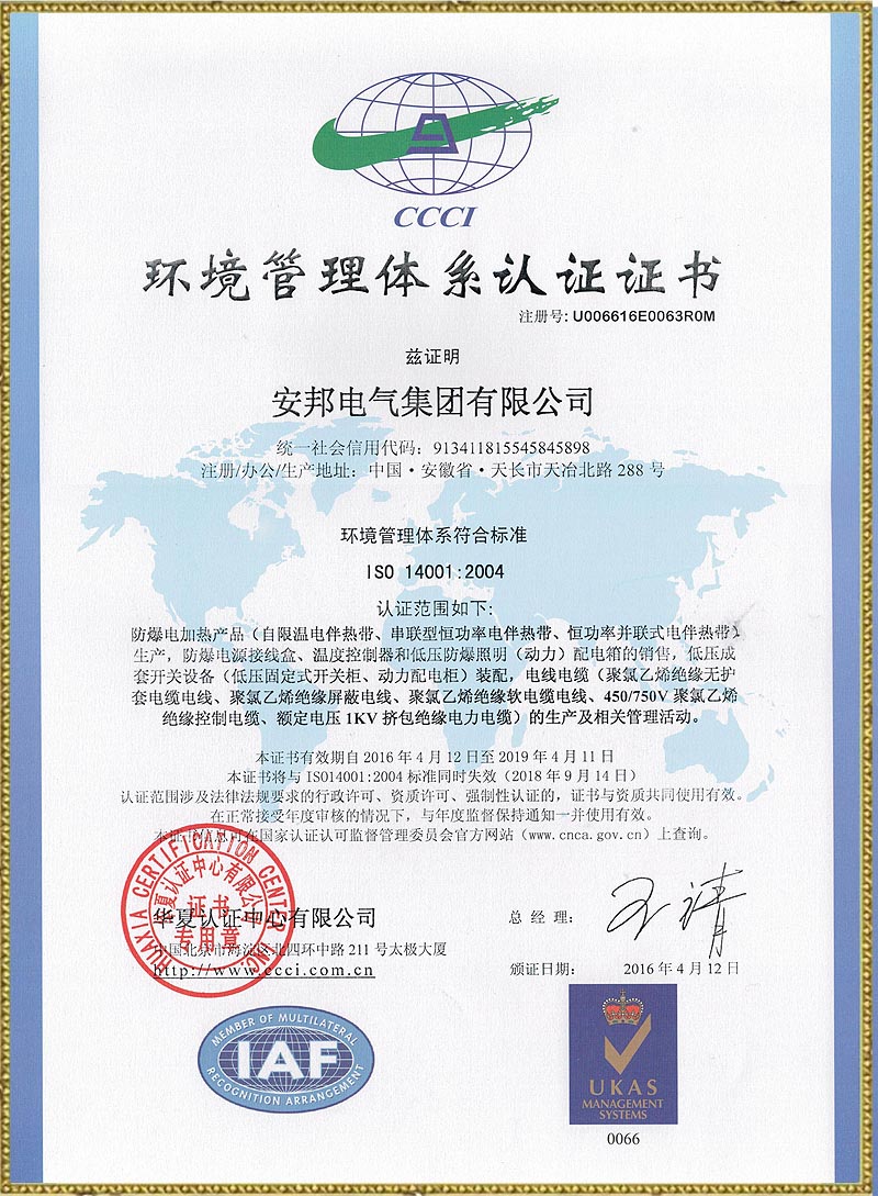 ISO14001環境管理體系認證證書