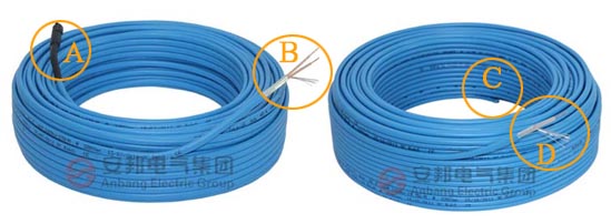 3、雙導發熱電纜一端為尾端(見圖中A部分),另一端為冷線(見圖中B部分);單導發熱電纜兩端均為冷線(見圖中C和D部分)。