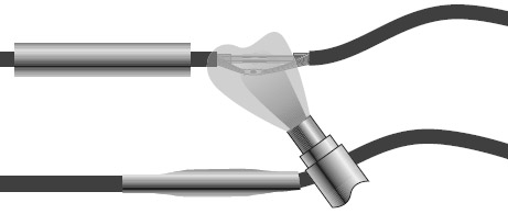 將導線與套管連接,將小號收縮管拉過來,用火焰槍使管子收縮。屏蔽層不需要收縮管。