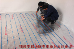 發熱電纜必須按設計圖紙要求間距鋪設在鋼絲網上,誤差≤±10mm最小彎曲半徑為6倍電纜直徑,發熱電纜鋪設應美觀、平直。不許摔打發熱電纜。固定方式:用綁扎帶或塑料卡釘將發熱電纜固定在鋼絲網上。注意事:發熱線部分,必須鋪設在地面絕熱層上部,不允許相互搭接,發熱電纜不允許凹進苯板中,冷熱線接頭處有明確標石。